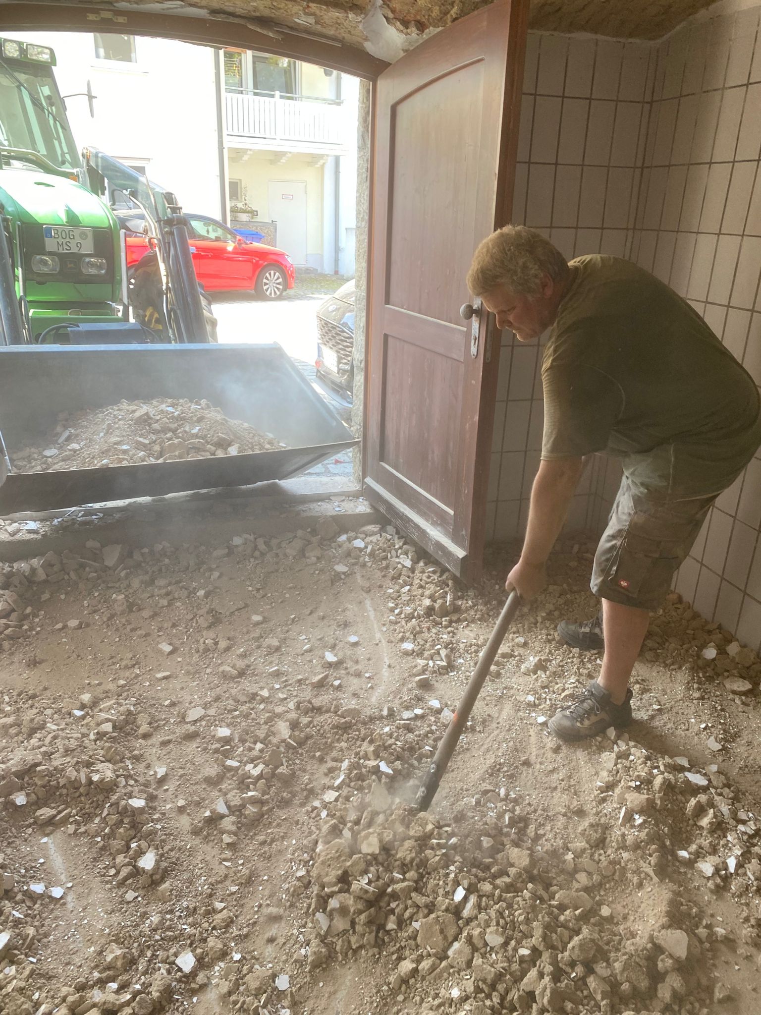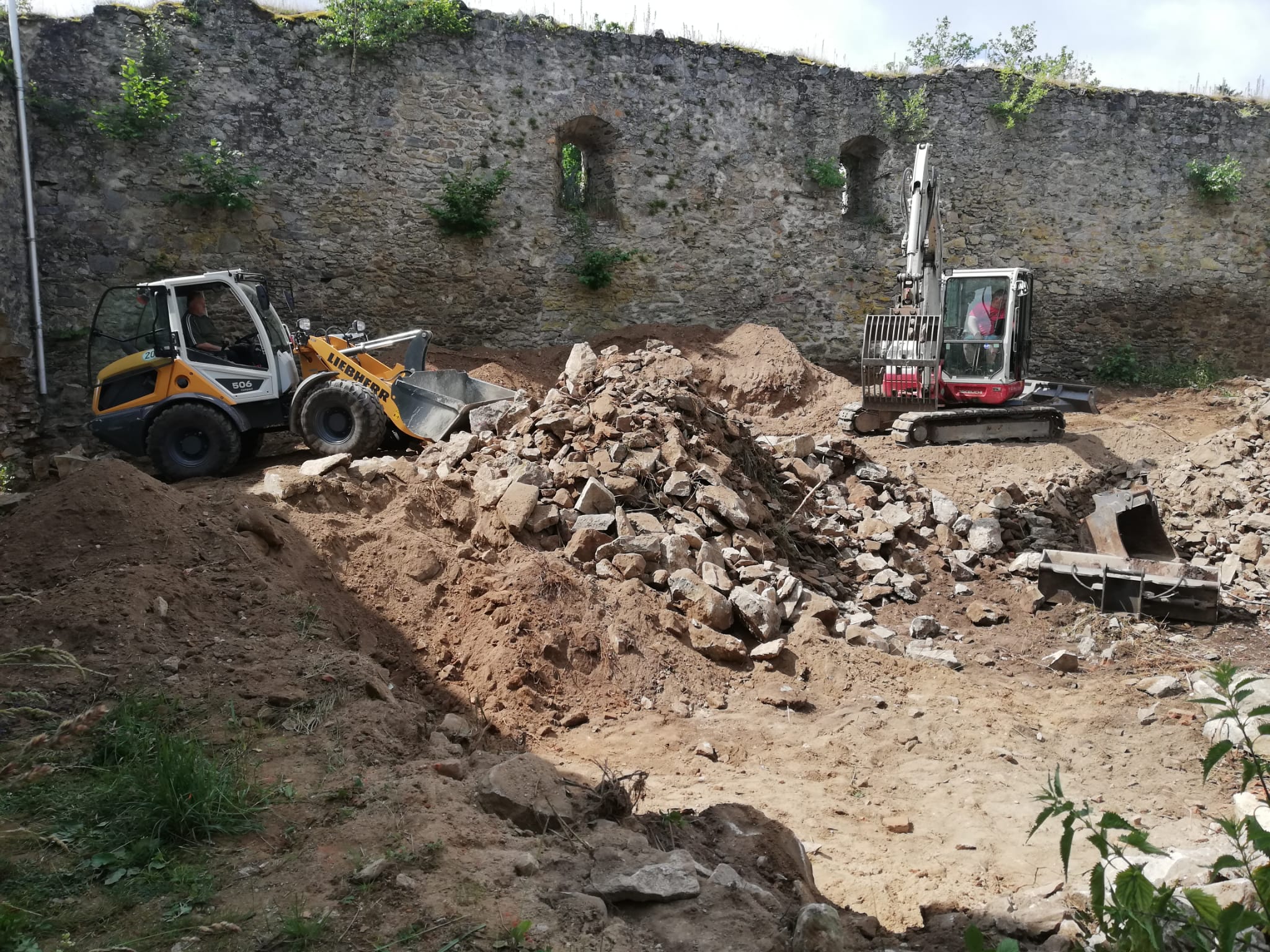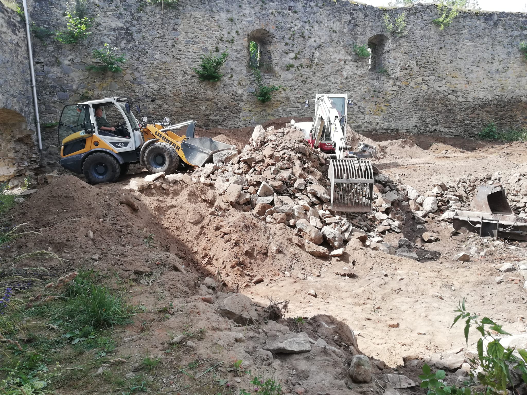 Aus dem Keller 2 wurde der Schutt entfernt. Der Innenhof wurde eingeebnet und dabei kamen unzählige Tonscherben zutage. Der Schutt wurde gesiebt und die Steine fahren mit den Lader weggefahren. Die ausgesiebte Erde wird eingeebnet und als Wiese angesät.
