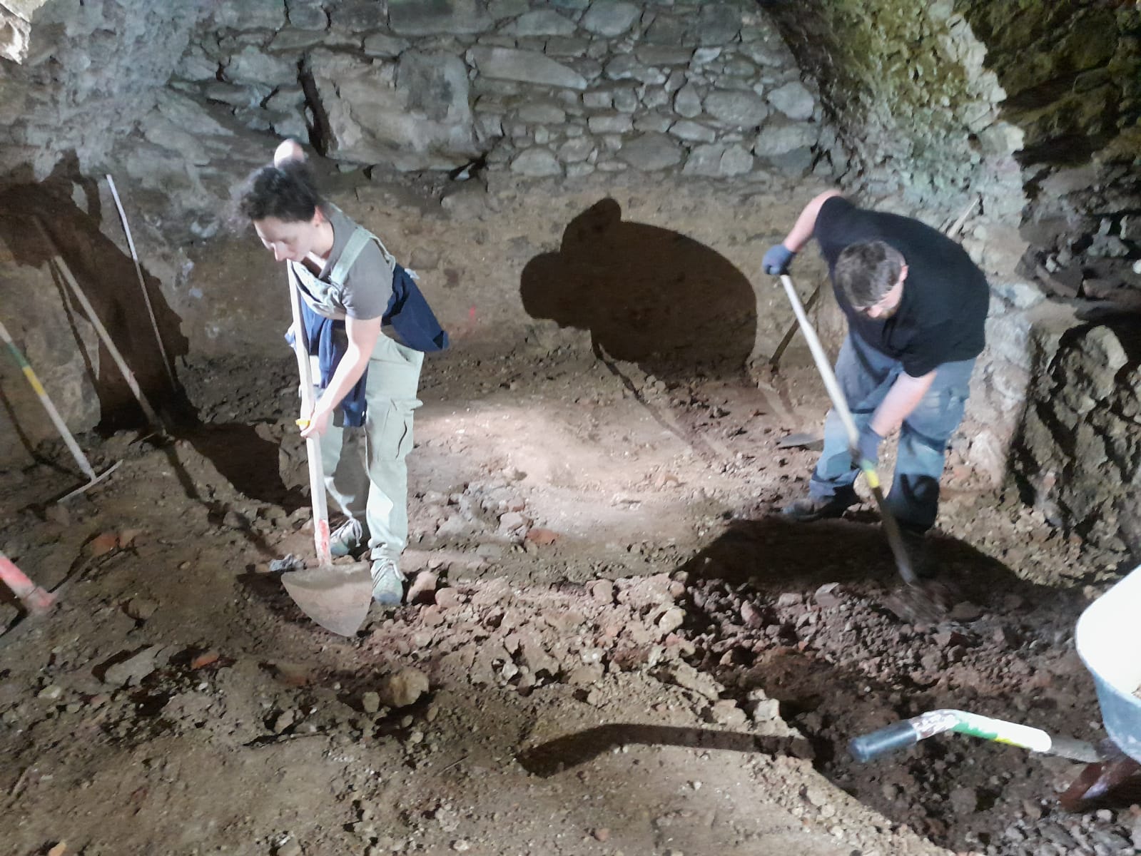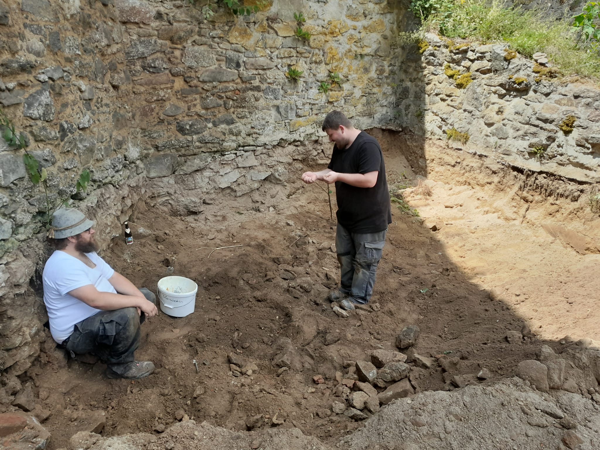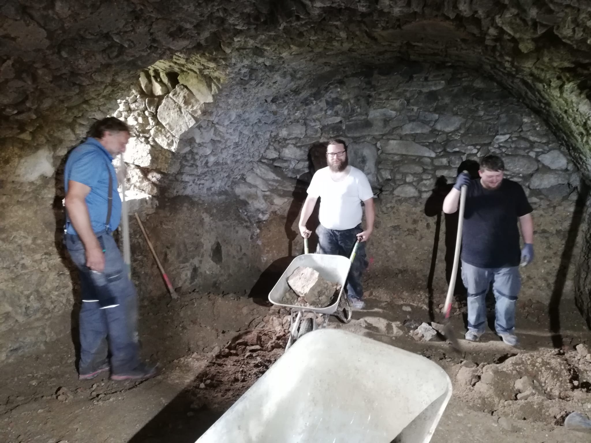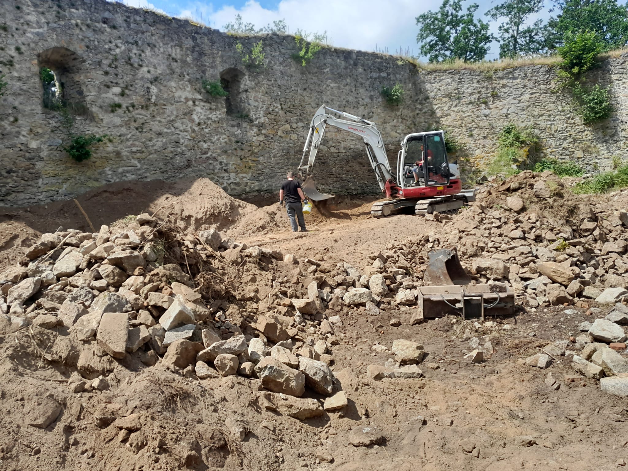 Aus dem Keller 2 wurde der Schutt entfernt. Der Innenhof wurde eingeebnet und dabei kamen unzählige Tonscherben zutage. Der Schutt wurde gesiebt und die Steine fahren mit den Lader weggefahren. Die ausgesiebte Erde wird eingeebnet und als Wiese angesät.