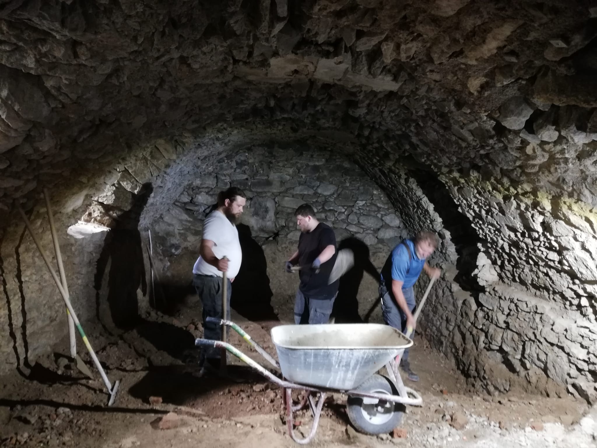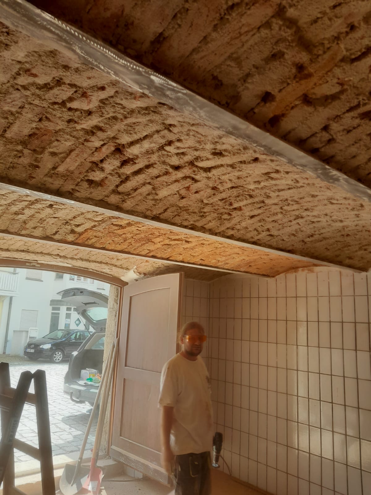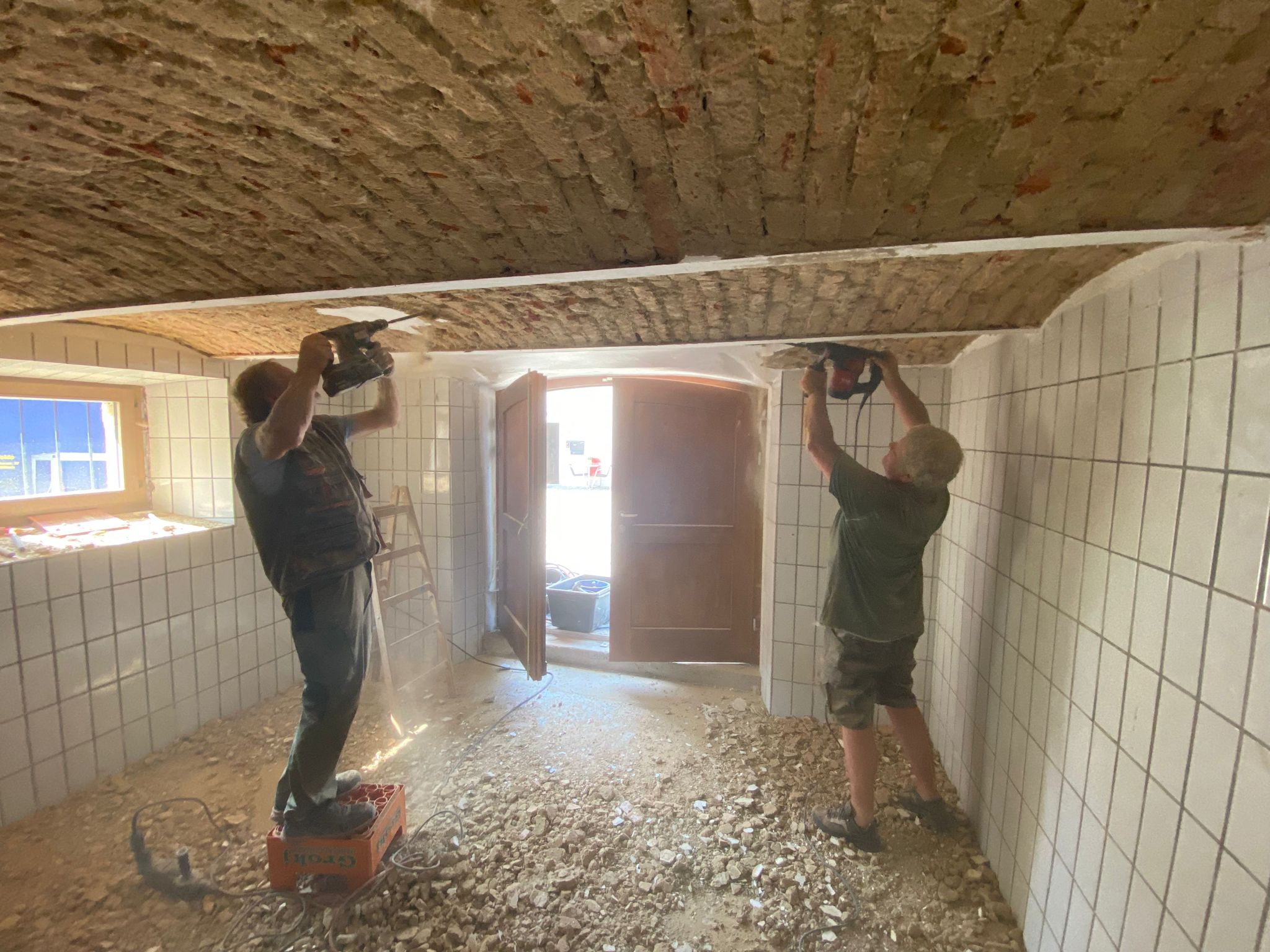 Das  Burgmuseum  nimmt Gestalt an. Heute  haben wir zu viert die Gewölbedecke freigelegt, die Eisenschiene abgeschliffen und die Ziegelgewölbe Sandgestrahlt bzw. Abgebürstet.  Sind nicht ganz fertig  geworden  zum abputzen. Nun kann unser Maurer Tobias Schollerer nächste Woche die Fliesenwände verputzen und flache Steine miteinbauen. Das Fenster mit Eisenstangen ist vom Schreiner Holzapfel schon  eingebaut.