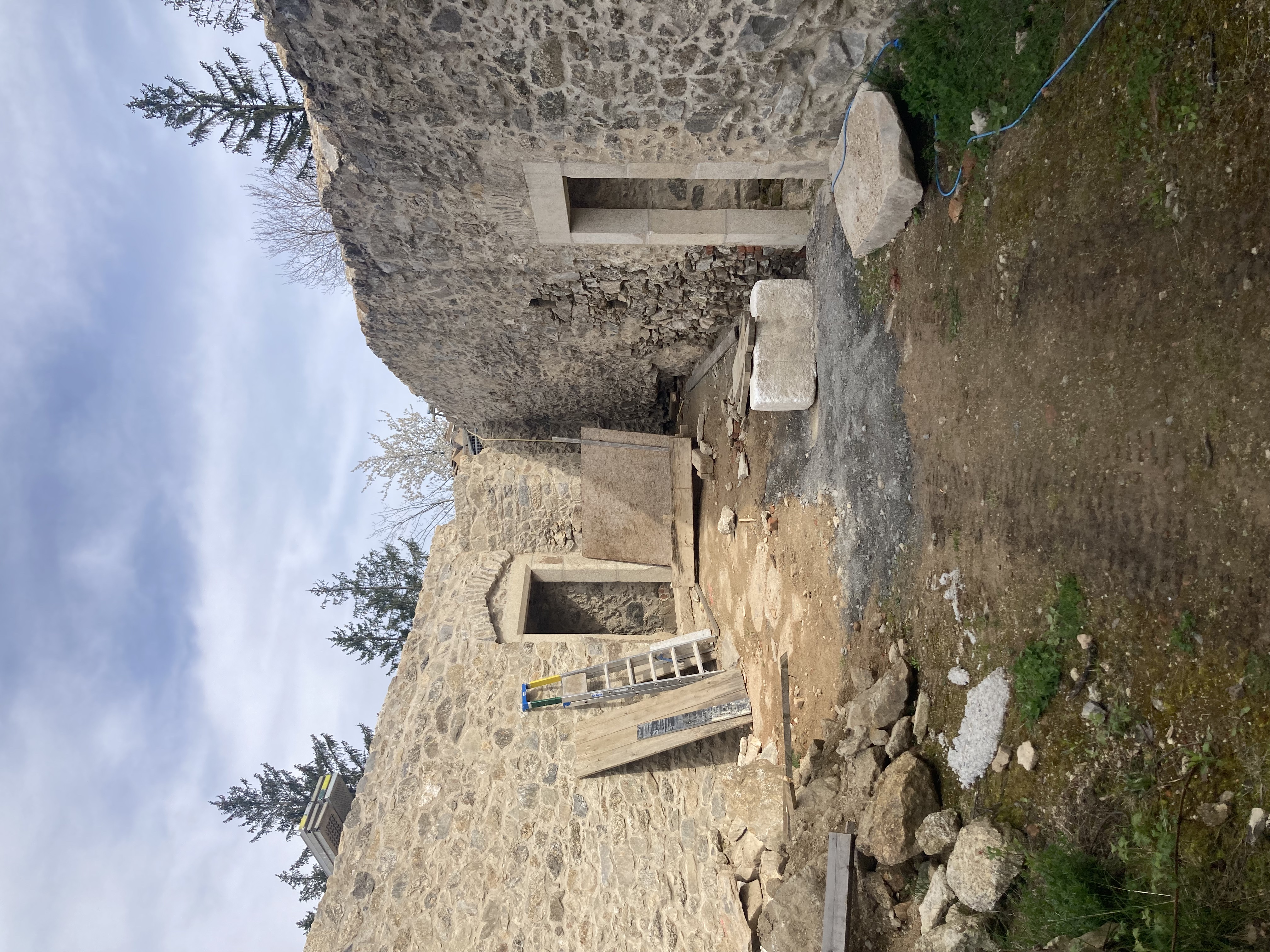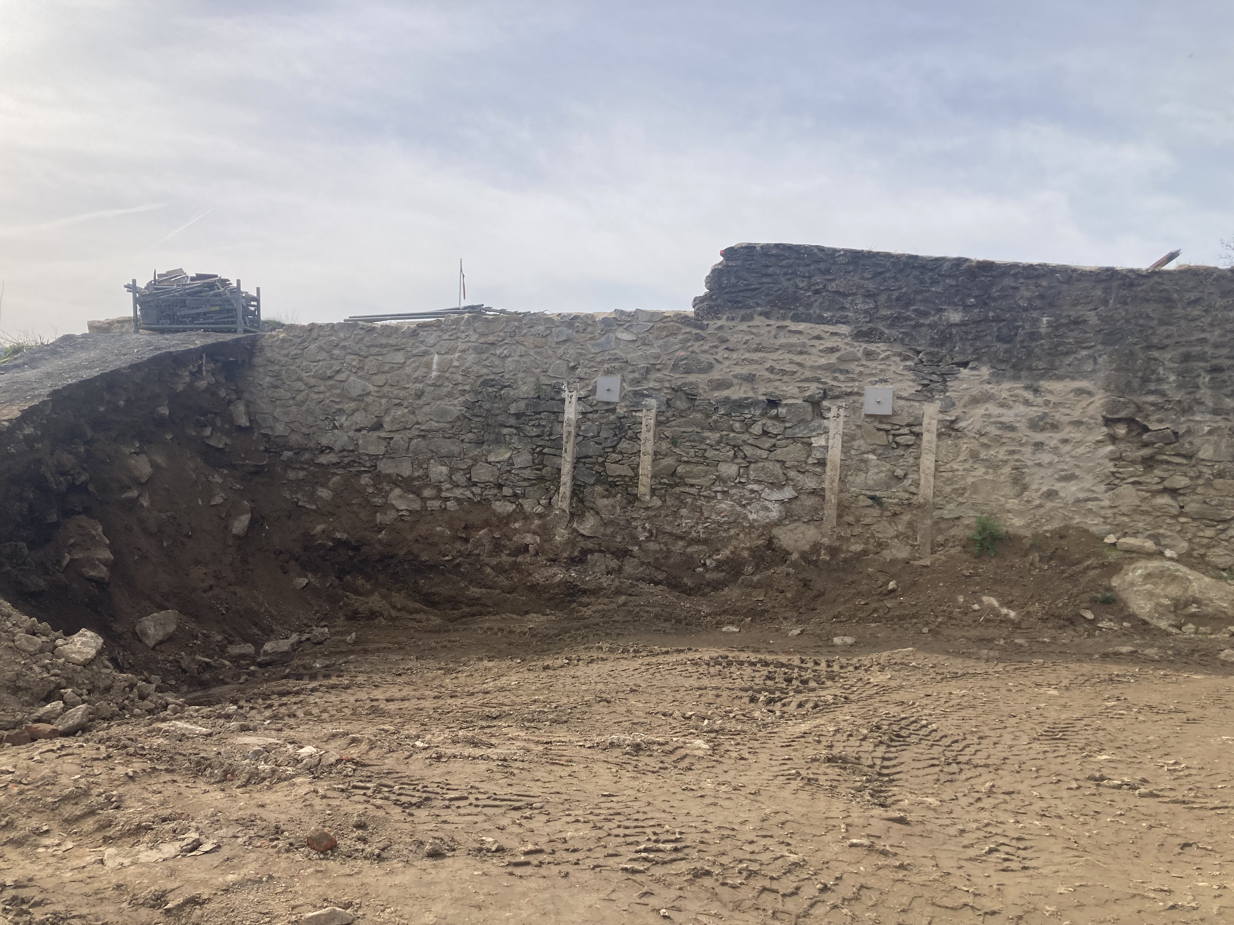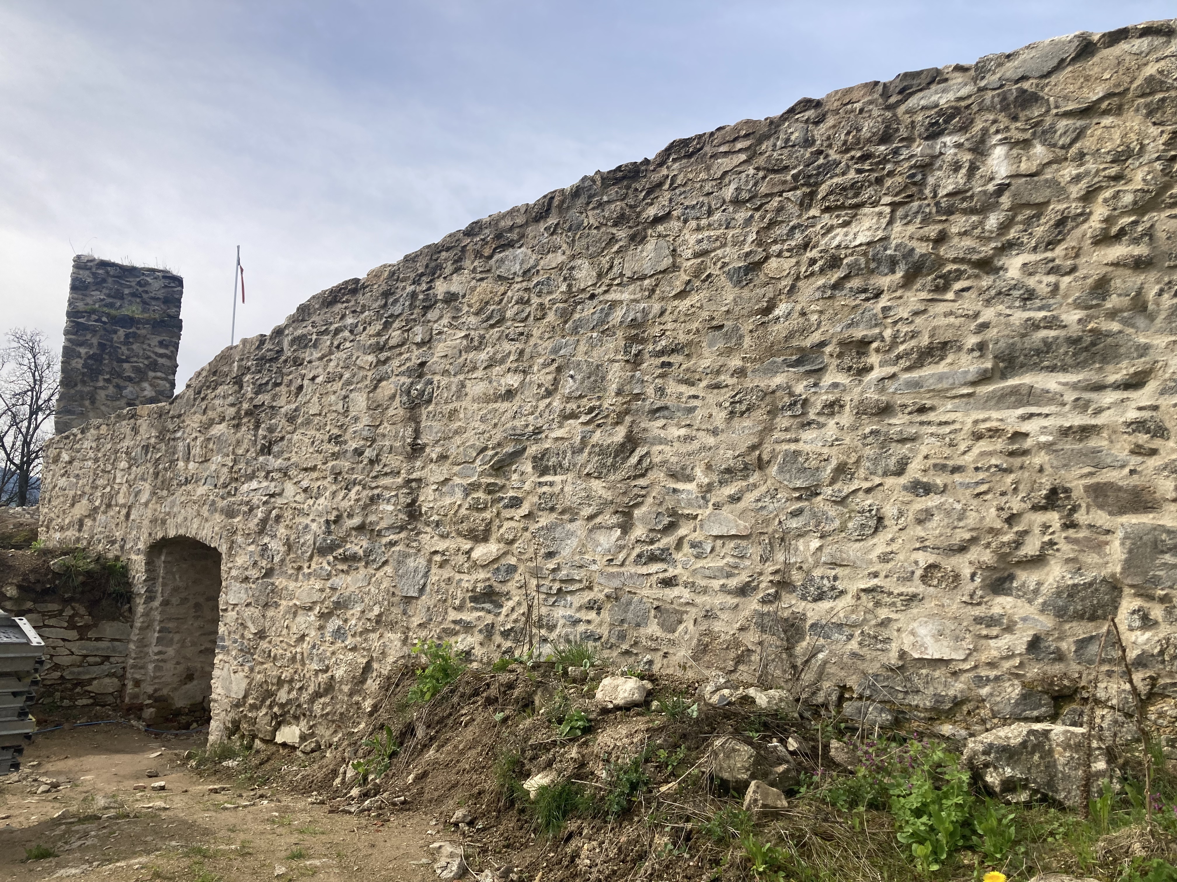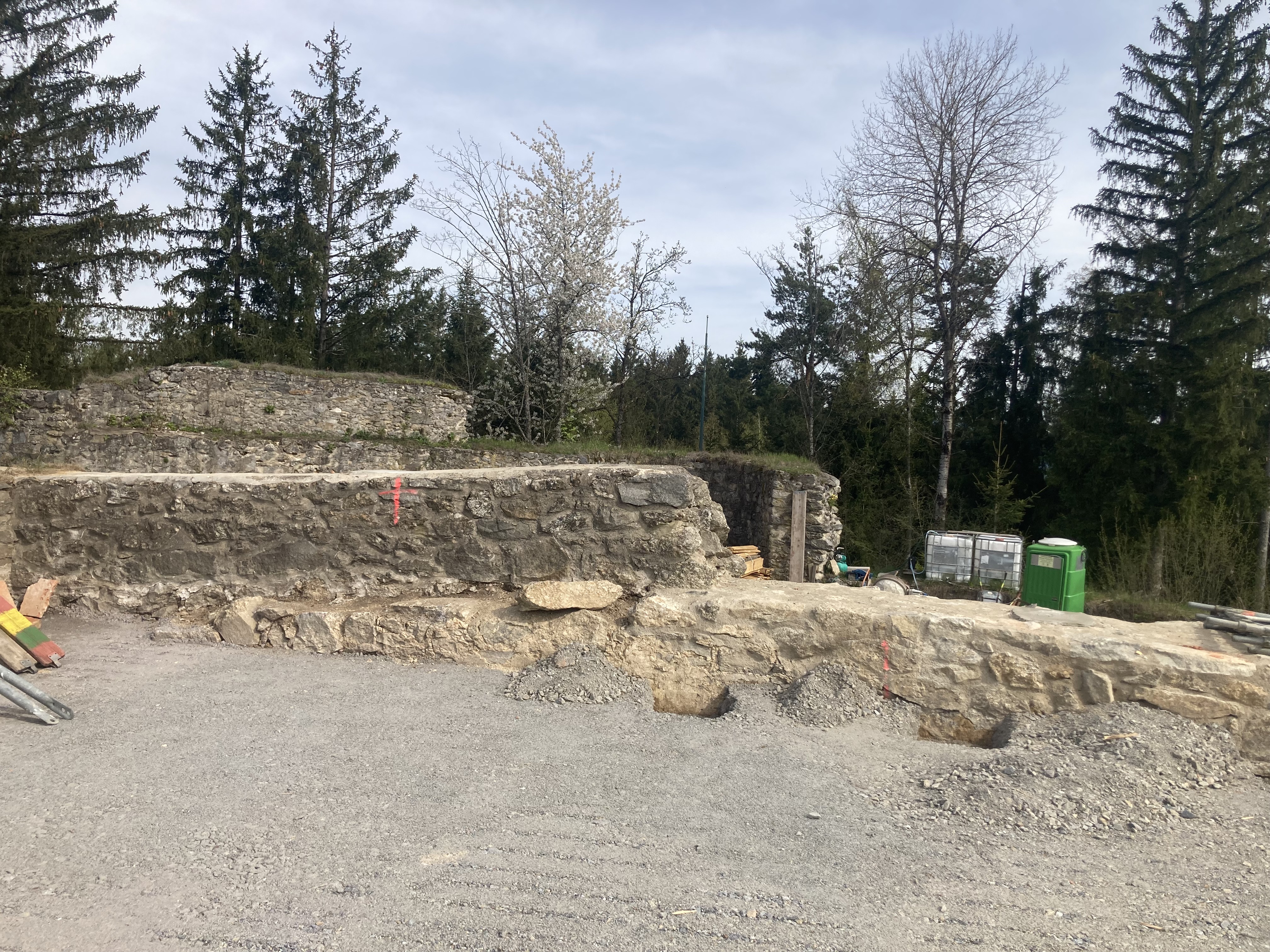 Um das alte Baudach zu entfernen und das neue Schutzdach errichten zu können, musste Platz für einen Mobilkran geschaffen werden. Dazu wurde der Schuttberg bei der Auffahrt zum Dach mit dem Lader, gefahren von Thomas Piller, entfernt.