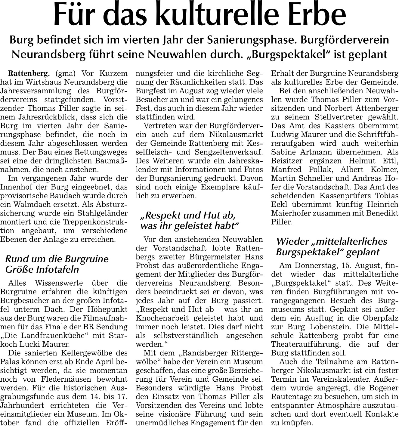 Dies ist der Start für eine kulturelle Nutzung dieser einmaligen Kulisse und eine Bereicherung für die Gemeinde Rattenberg und den bayerischen Wald. Mit viel Muskelkraft und Herzblut haben die Mitglieder des Fördervereins Burg Neurandsberg die Burgruine hergerichtet.
