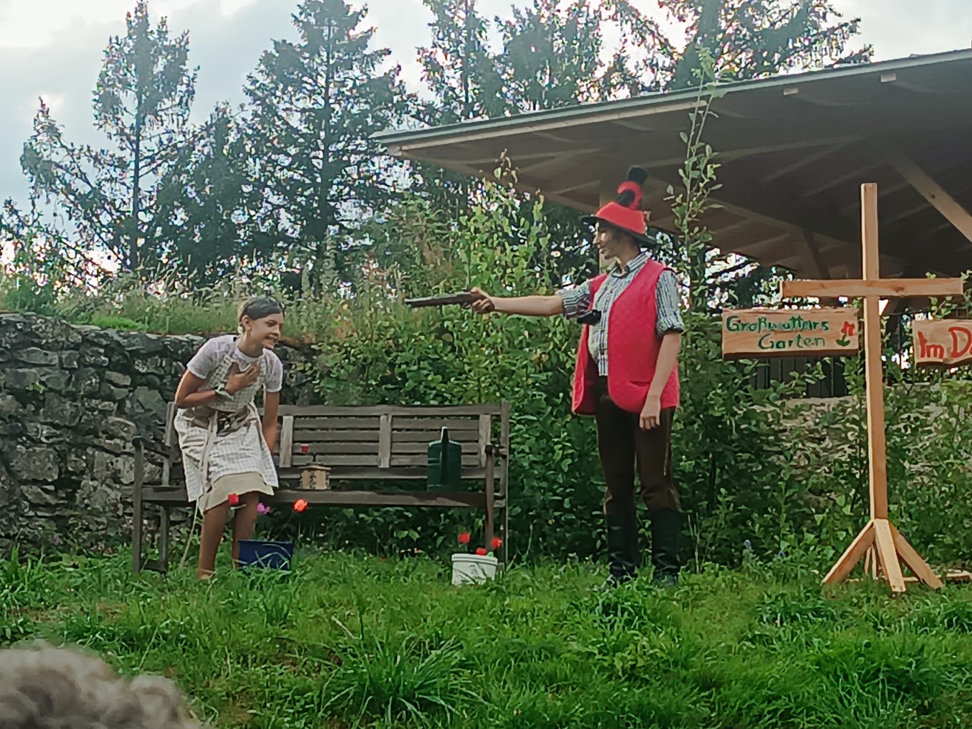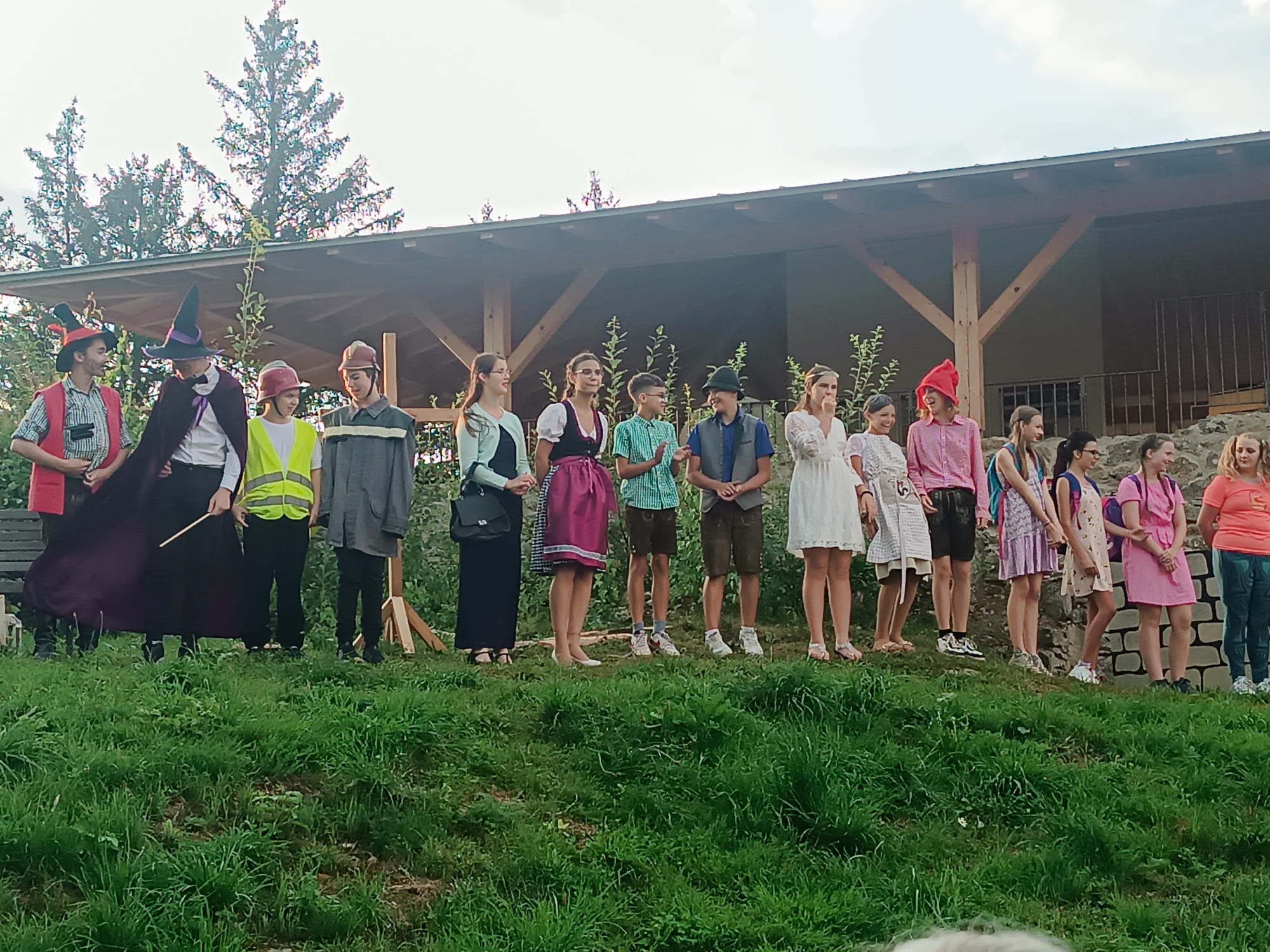 Die Theatervorstellung der 6. Klasse Mittelschule Rattenberg zog trotz bewölktem Himmel um die 200 große und kleine Besucher an. Pünktlich zum Start des Stückes riß auch der Himmel auf und sogar die Sonne blitzte ab und zu auf die Zuschauer. Begrüßt wurden die Gäste vom Rektor der Mittelschule Rattenberg, der auch der Lehrerin Frau Anja Huber für ihr Engagement und die Regieführung dankte. Ebenfalls wurden Dankworte an den Vorstand Thomas Piller und den Verein gerichtet.